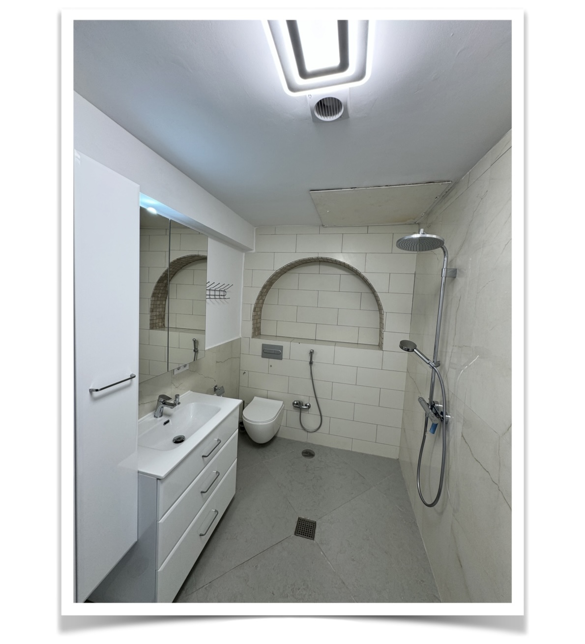 • Modern ausgestattetes Bad mit Dusche, Spiegelschrank und Waschmaschine