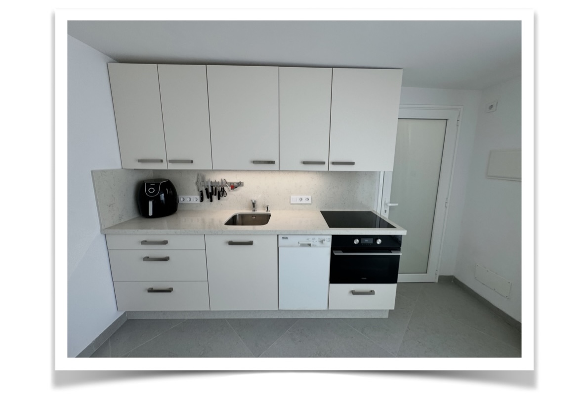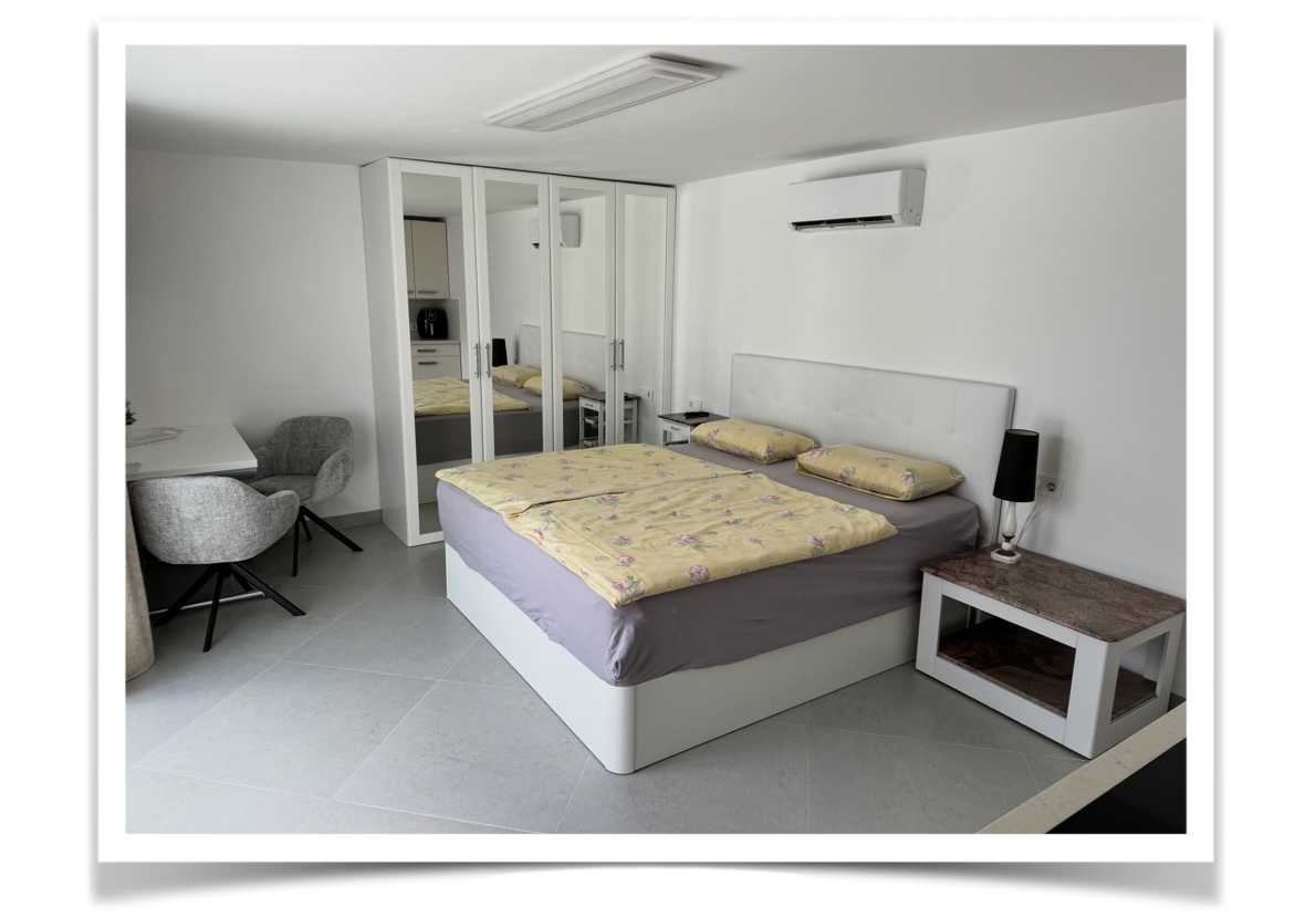 • Ferienappartement mit großem Bett und geräumigem Spiegelschrank, Einbauküche mit Geschirrspüler, Mikrowelle, Cerankochfeld und Backofen (Gesamt 30qm)