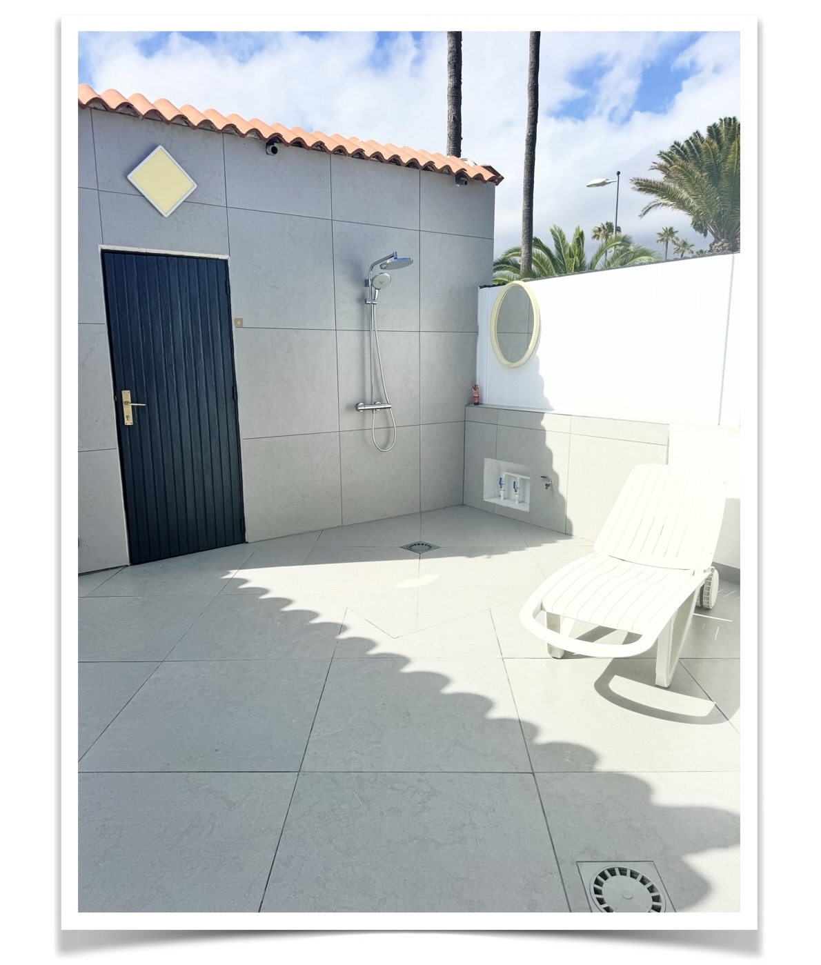 • Außendusche unter Palmen - duschen mit Blick in den blauen Himmel.